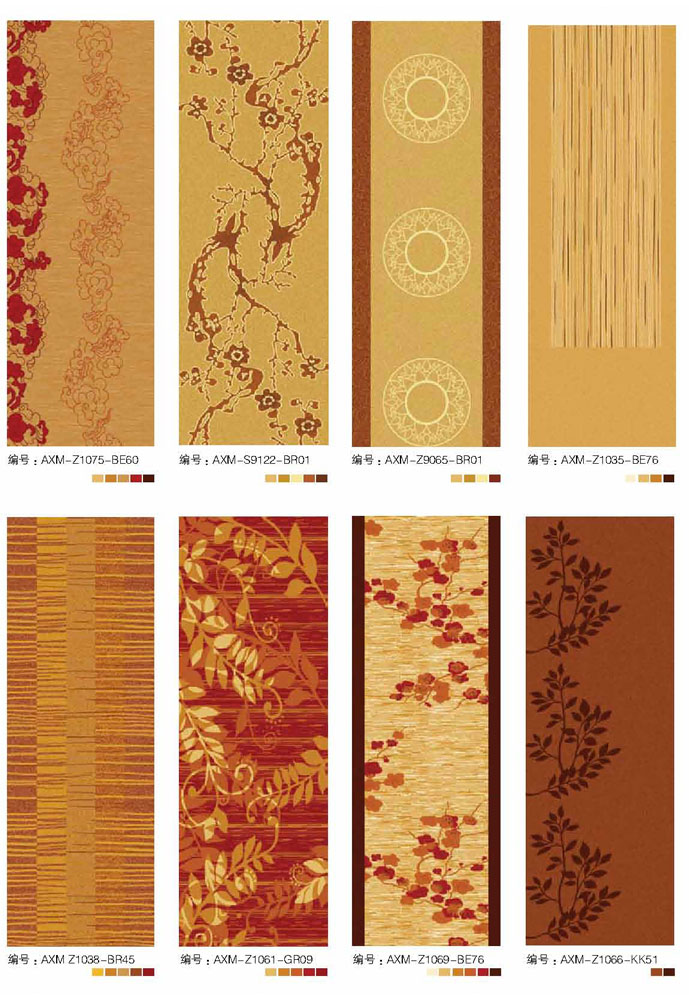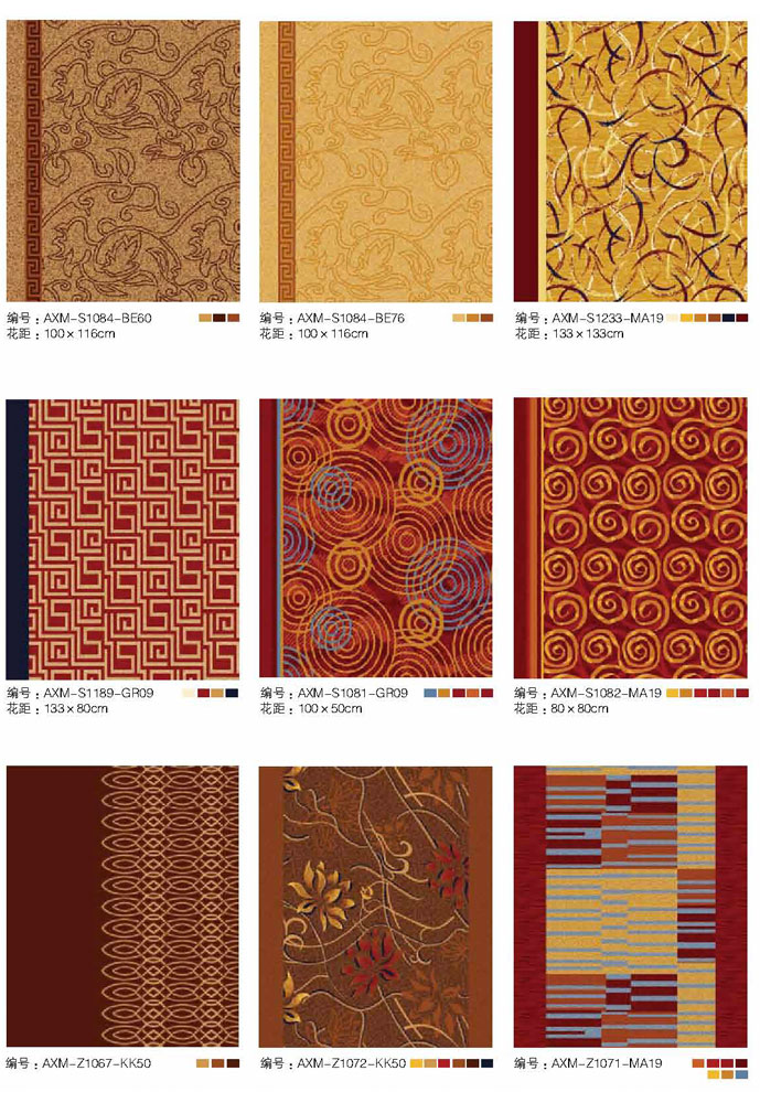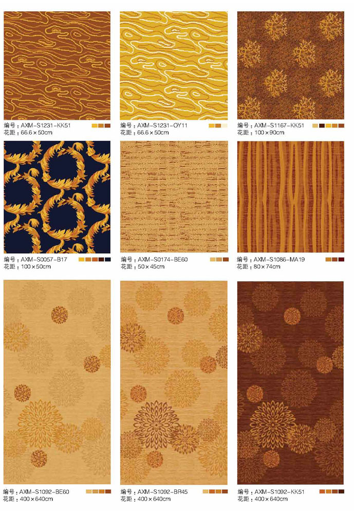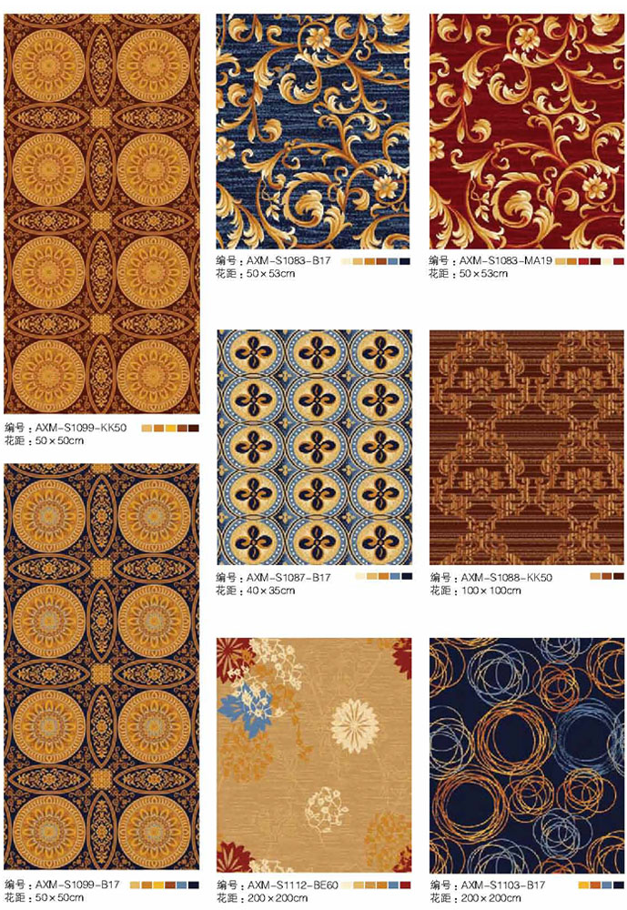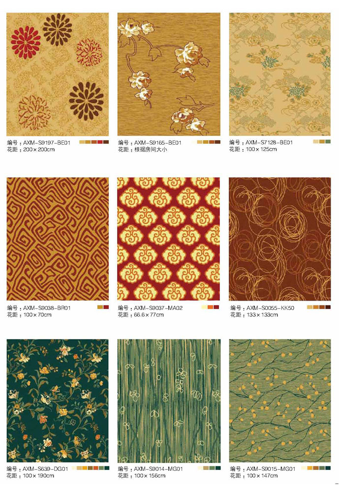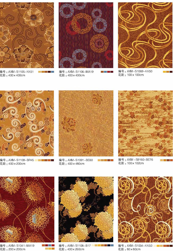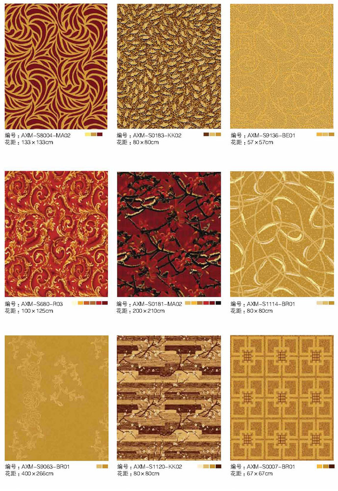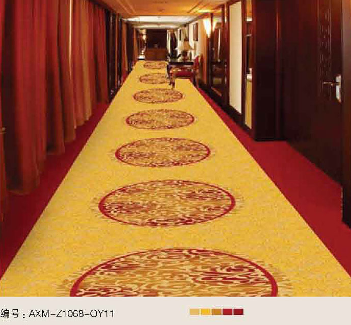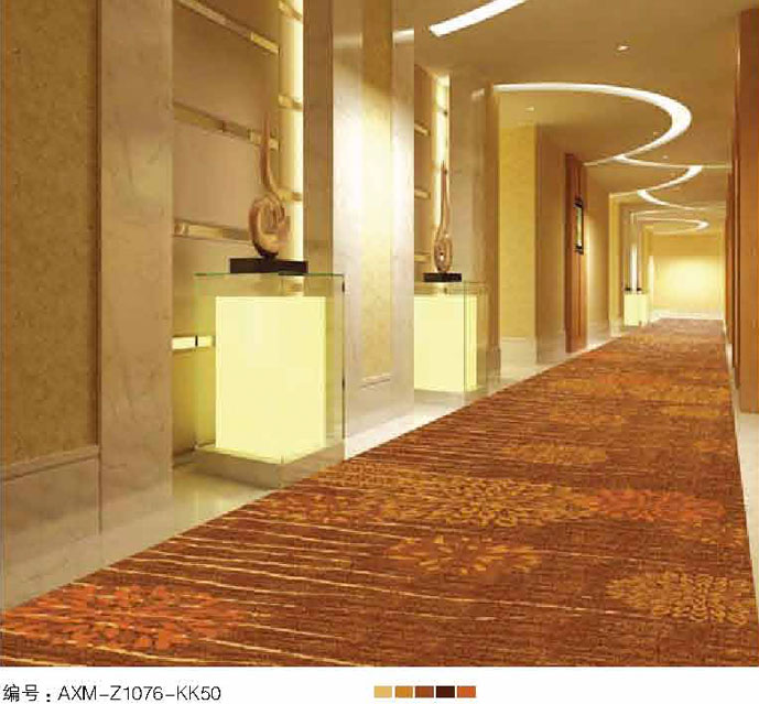阿克明地毯毯面平整、丰满,风格富丽堂皇,达到国际商业重量级地毯标准。具有卓越的外观保持性、耐用性、稳定性、舒适性,经久耐用。一般适用于酒店餐厅、走道、宴会厅、酒吧、会议室等公共场所。