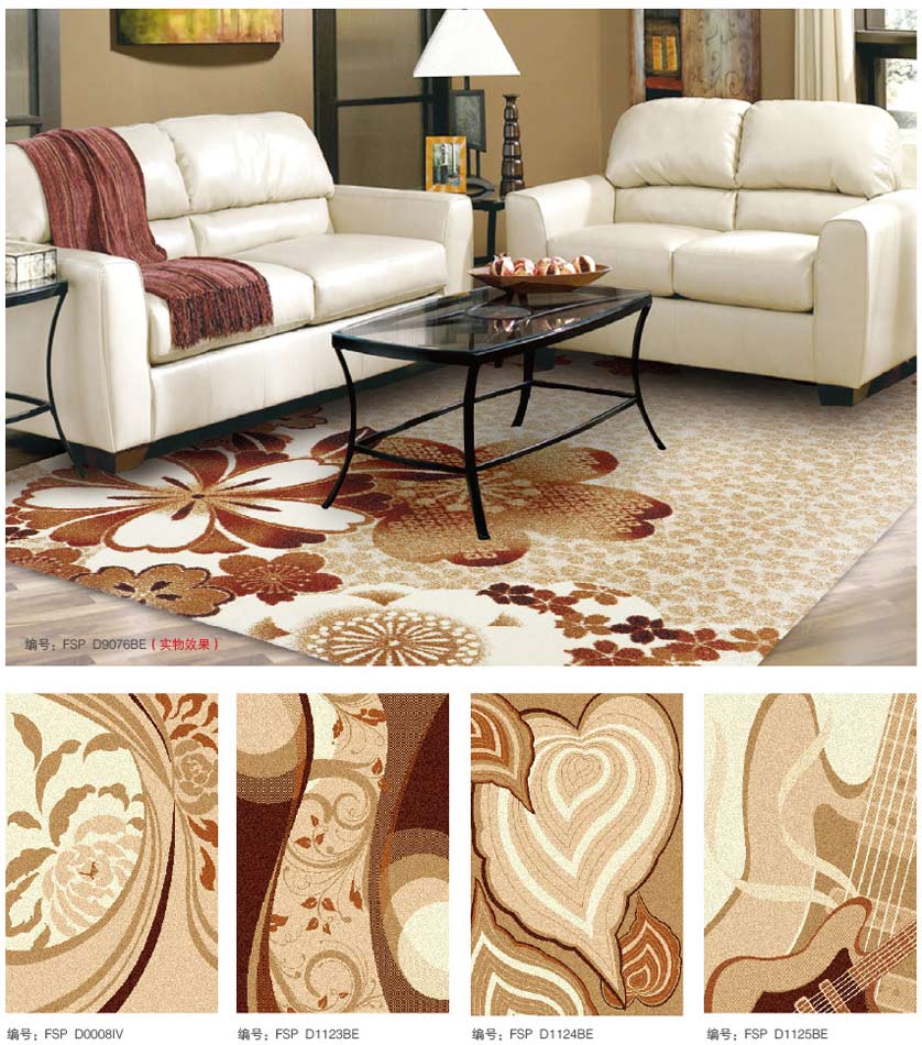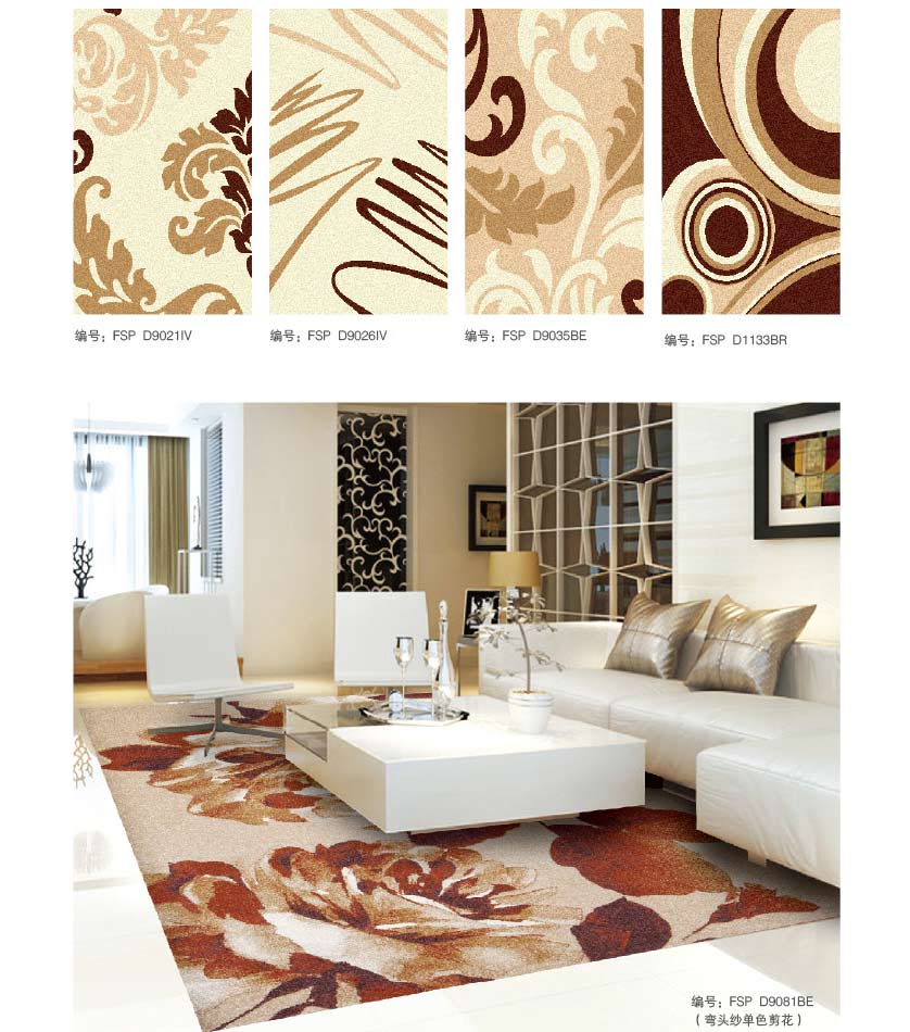 威尔顿地毯具有天鹅绒般的毯面效果,色彩和谐,温馨典雅。具有良好的绒头牢度、外观保持力、清晰的图案装饰能力。一般适宜制作家用块毯和酒店、公寓之客房毯。