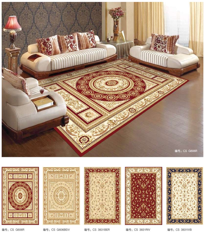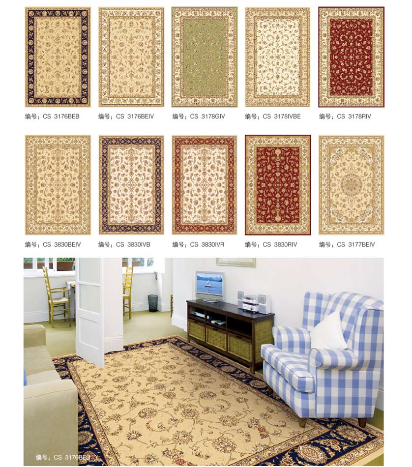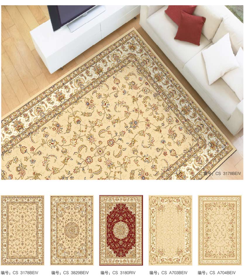 威尔顿地毯具有天鹅绒般的毯面效果,色彩和谐,温馨典雅。具有良好的绒头牢度、外观保持力、清晰的图案装饰能力。一般适宜制作家用块毯和酒店、公寓之客房毯。