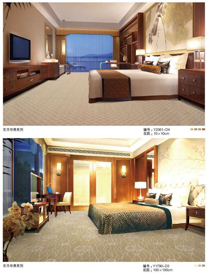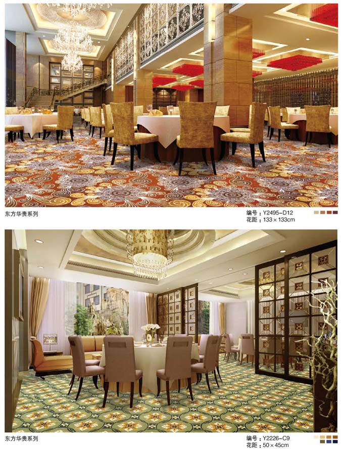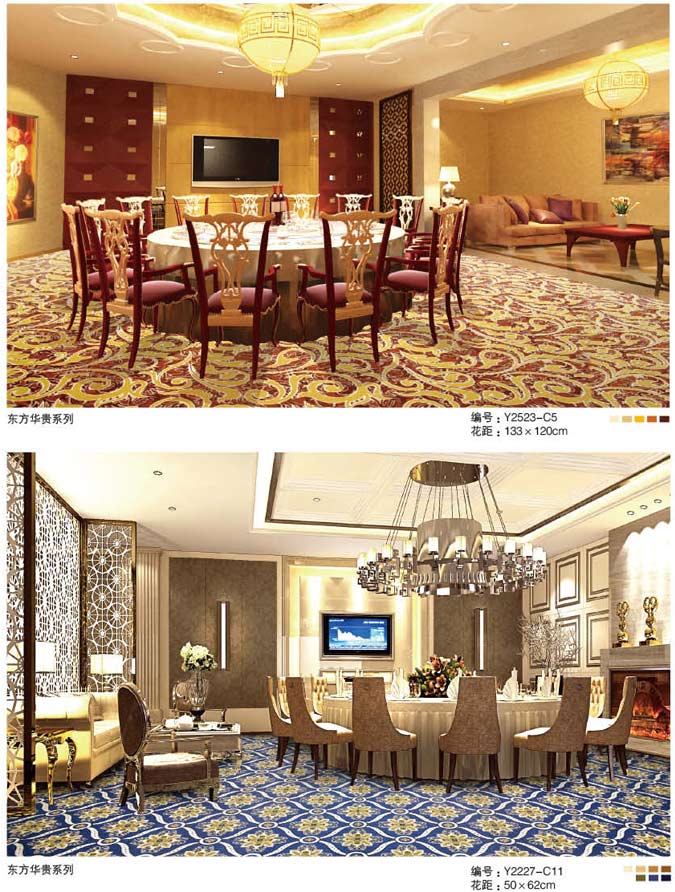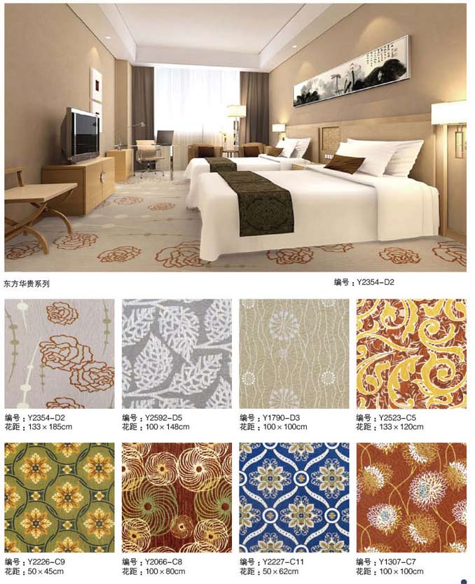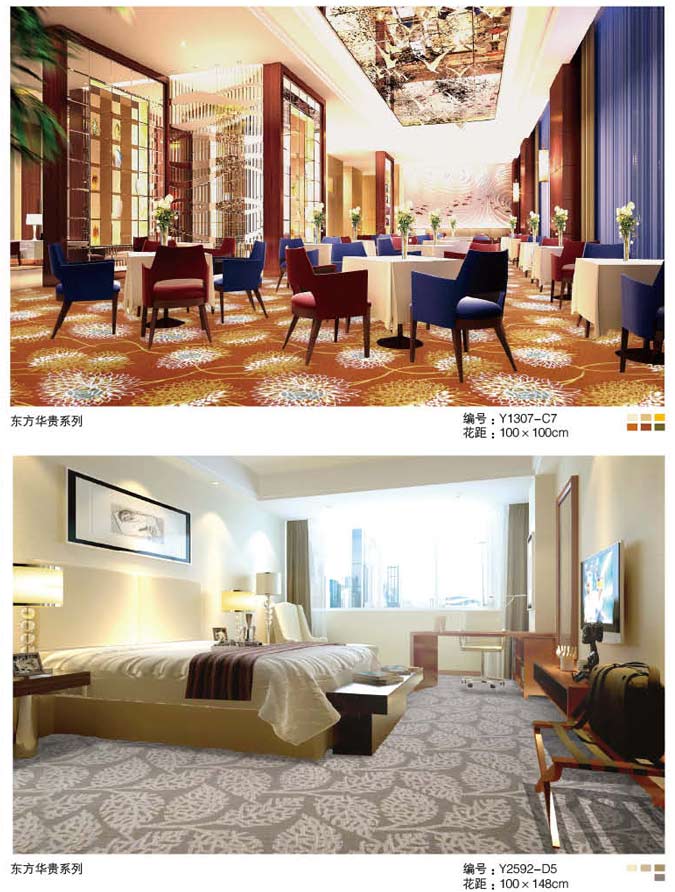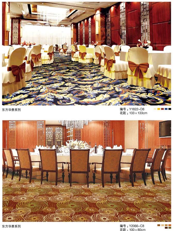印花地毯以尼龙为原料,具备地毯弹性好、色牢度高、防霉、防虫蛀等特点。适用于各大酒店会议厅、餐厅、咖啡厅等公共区域,并可用于客房、办公室等场所。