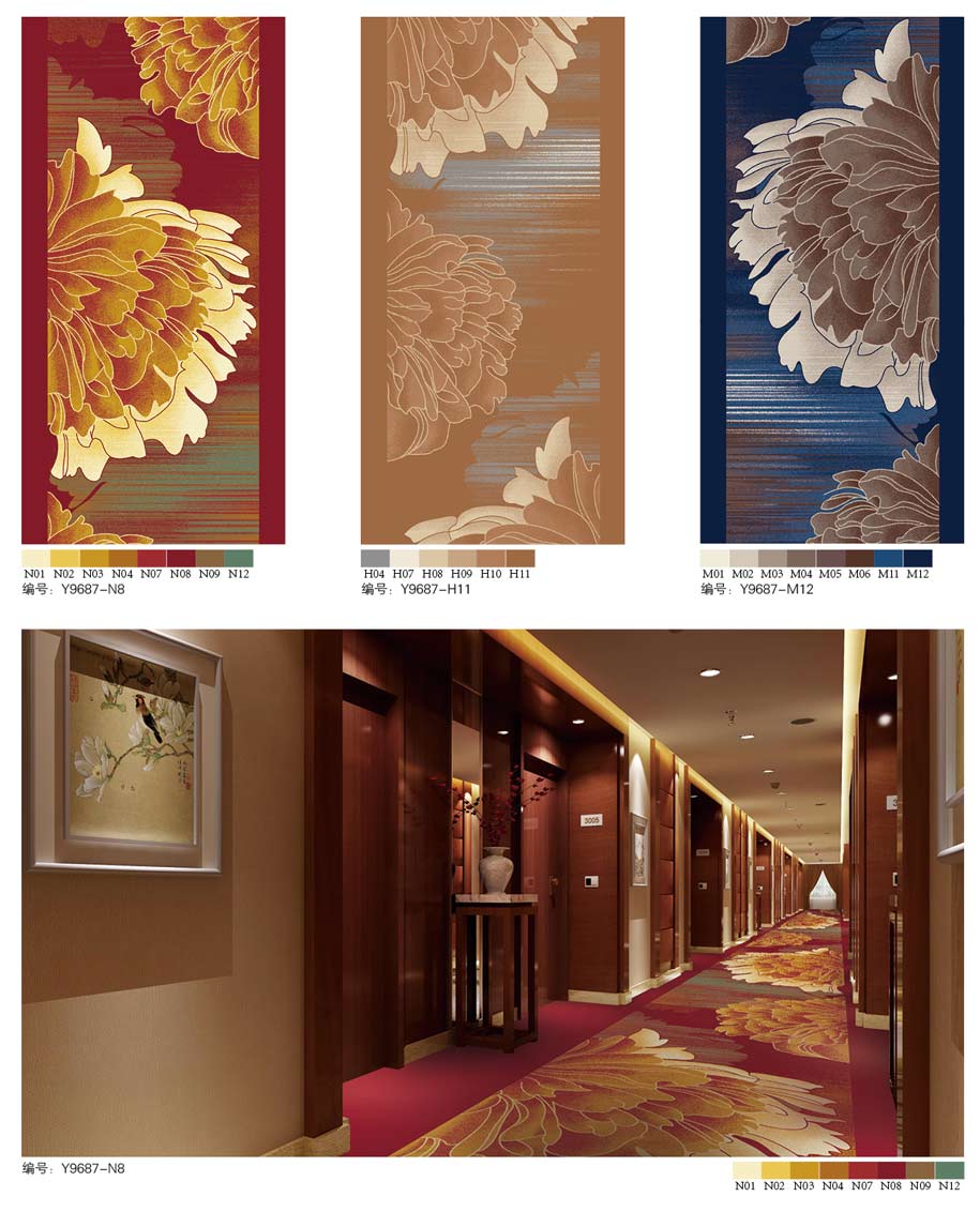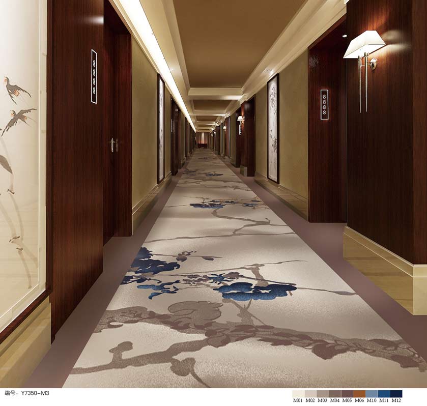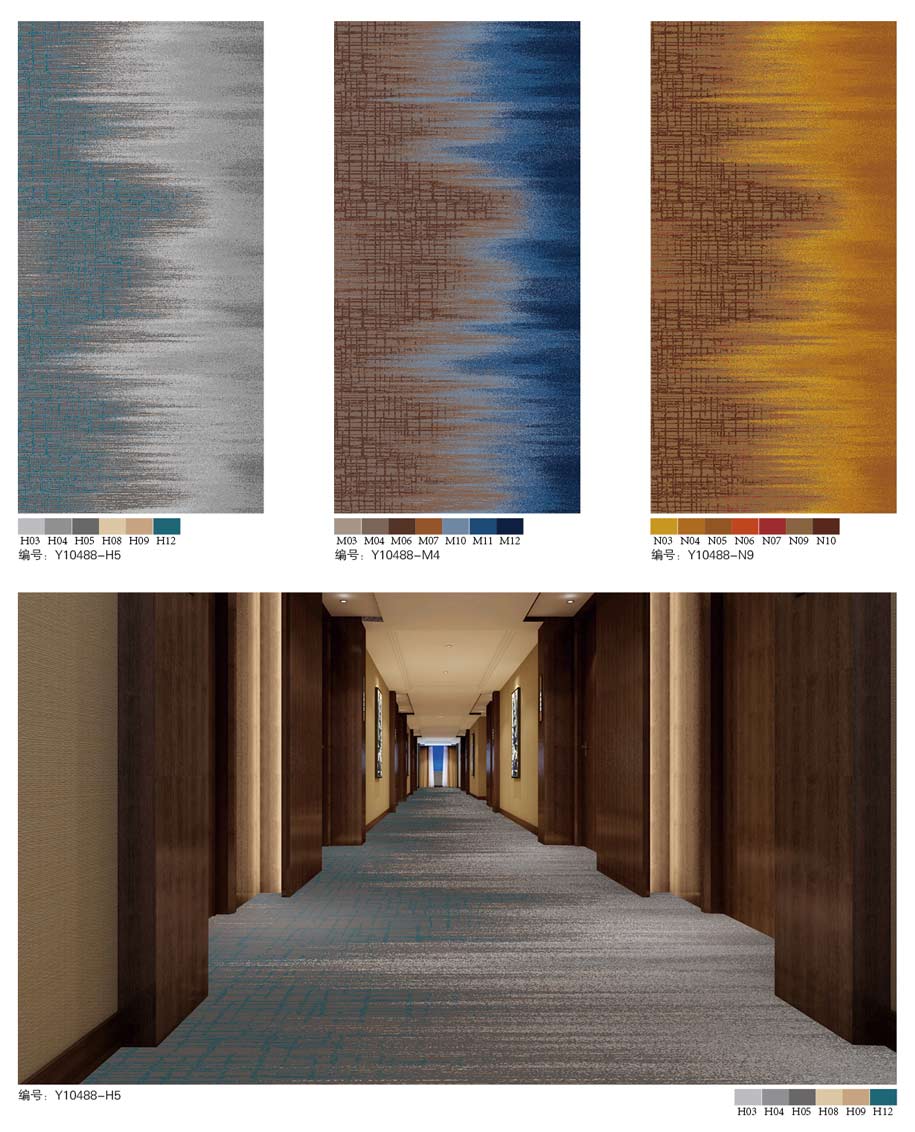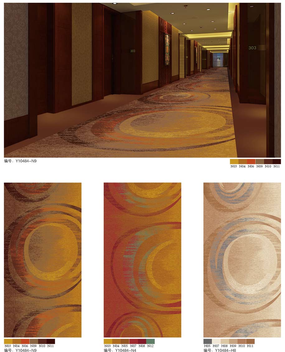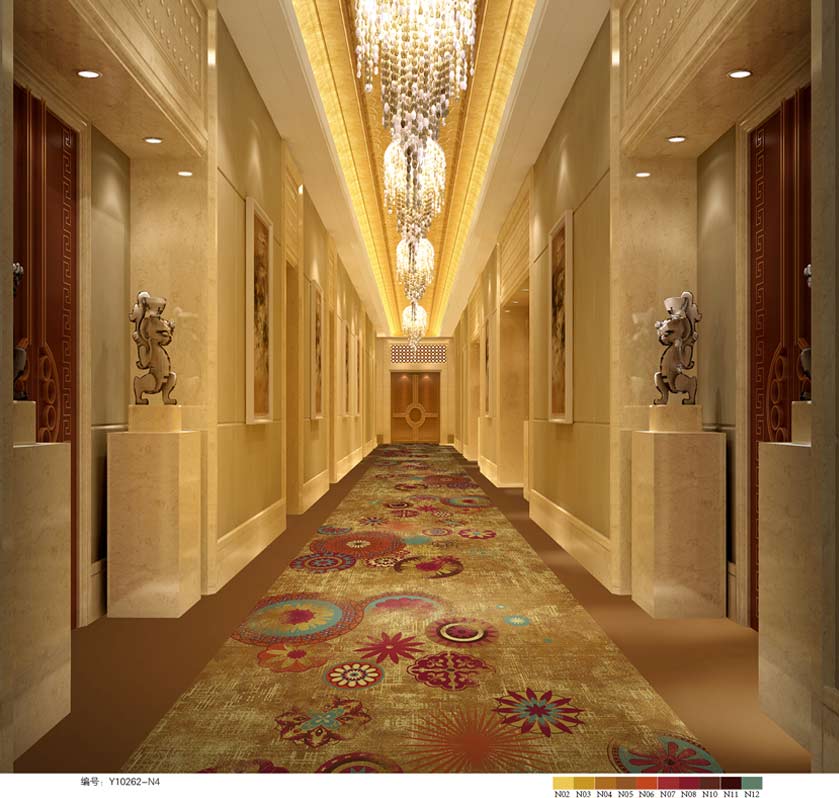 印花地毯以尼龙为原料,具备地毯弹性好、色牢度高、防霉、防虫蛀等特点。适用于各大酒店会议厅、餐厅、咖啡厅等公共区域,并可用于客房、办公室等场所。
