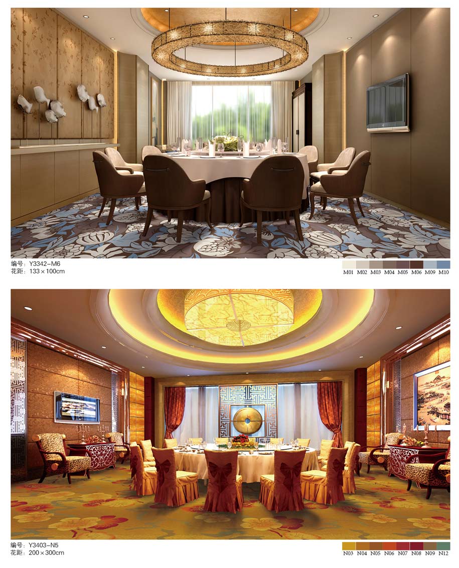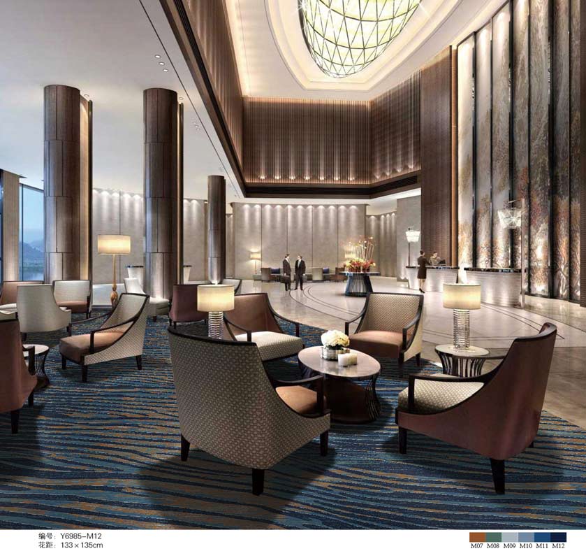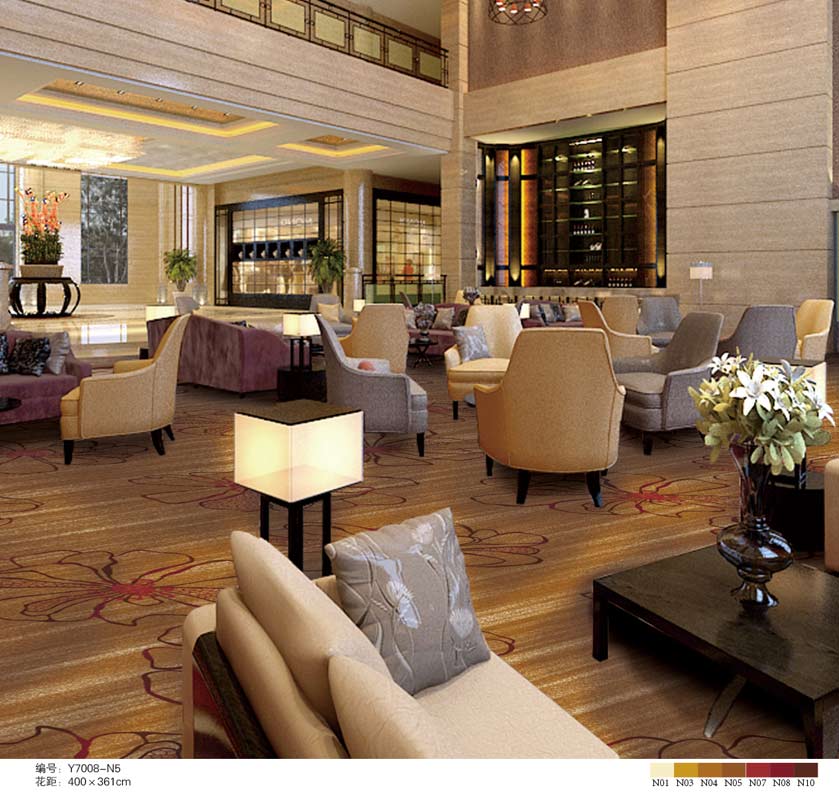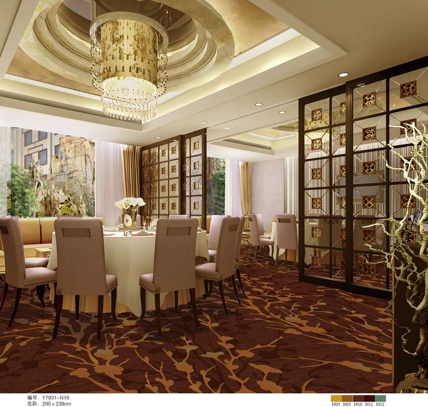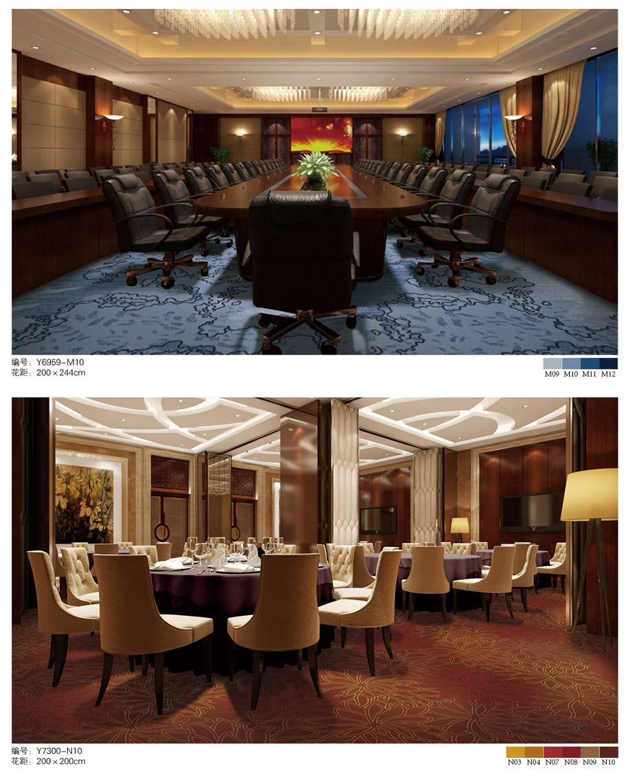 印花地毯以尼龙为原料,具备地毯弹性好、色牢度高、防霉、防虫蛀等特点。适用于各大酒店会议厅、餐厅、咖啡厅等公共区域,并可用于客房、办公室等场所。
