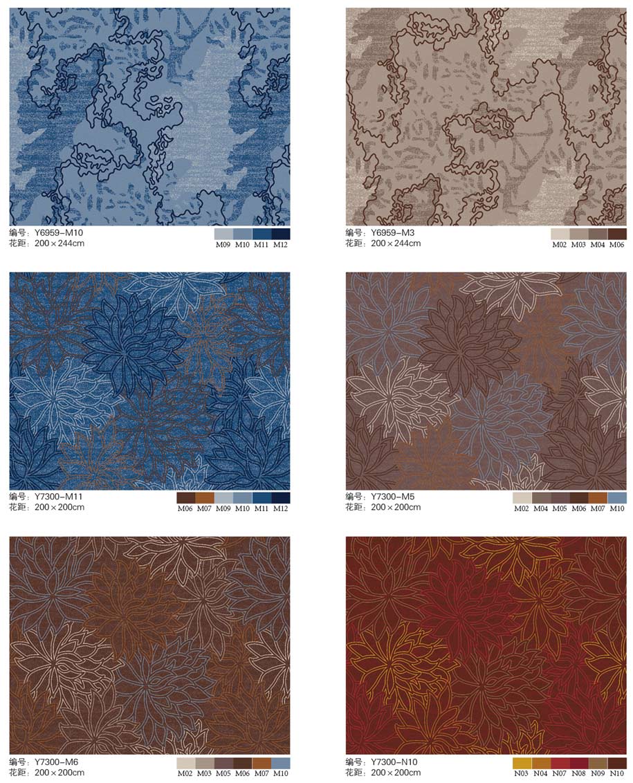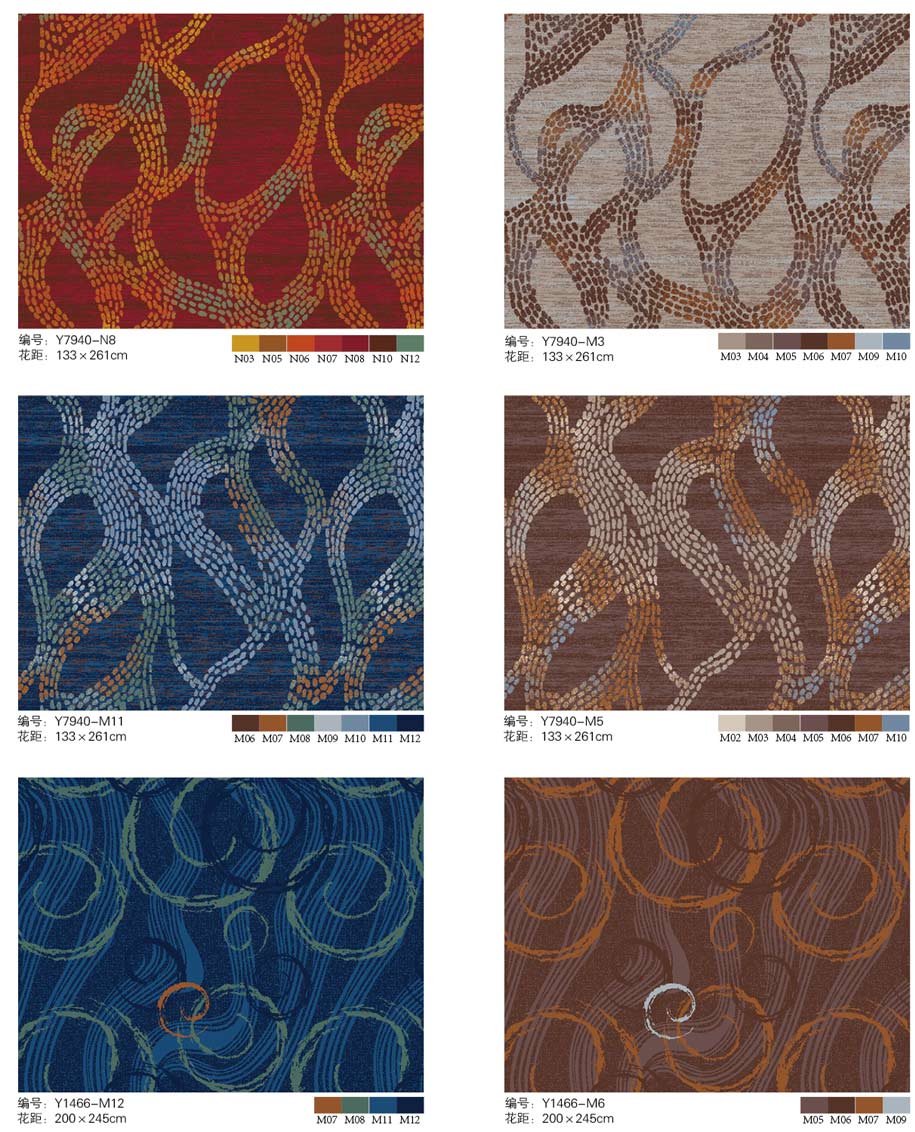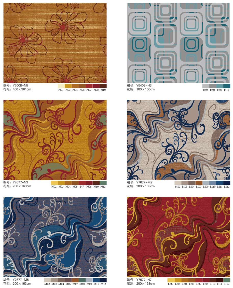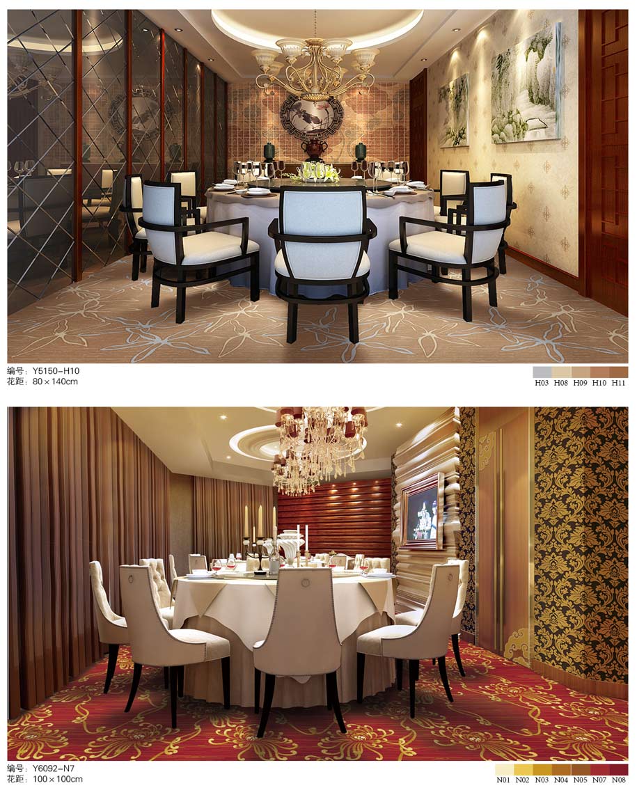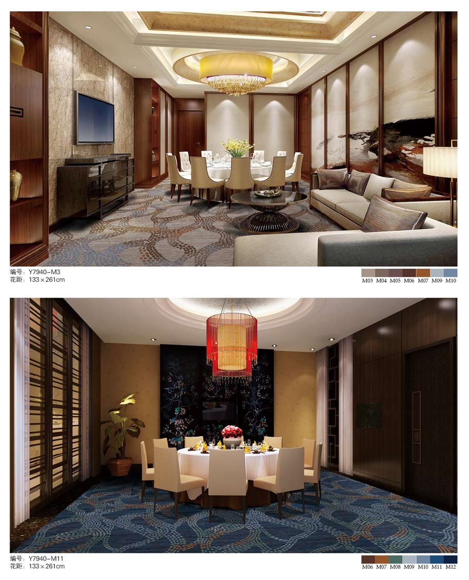 印花地毯以尼龙为原料,具备地毯弹性好、色牢度高、防霉、防虫蛀等特点。适用于各大酒店会议厅、餐厅、咖啡厅等公共区域,并可用于客房、办公室等场所。