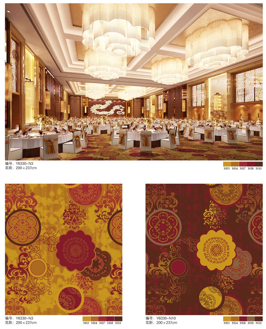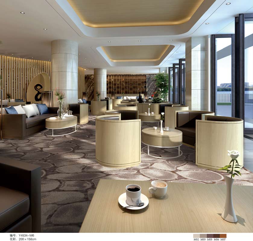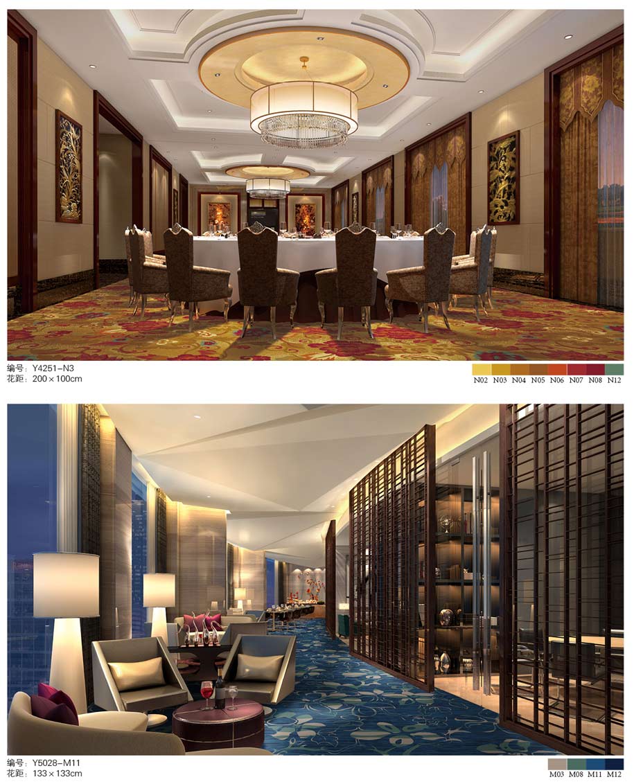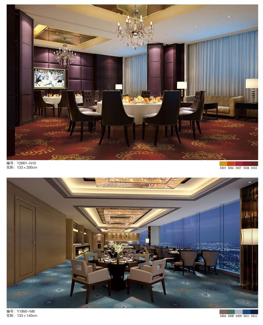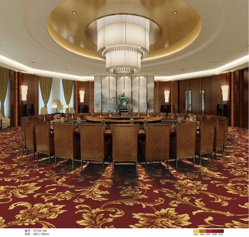 印花地毯以尼龙为原料,具备地毯弹性好、色牢度高、防霉、防虫蛀等特点。适用于各大酒店会议厅、餐厅、咖啡厅等公共区域,并可用于客房、办公室等场所。