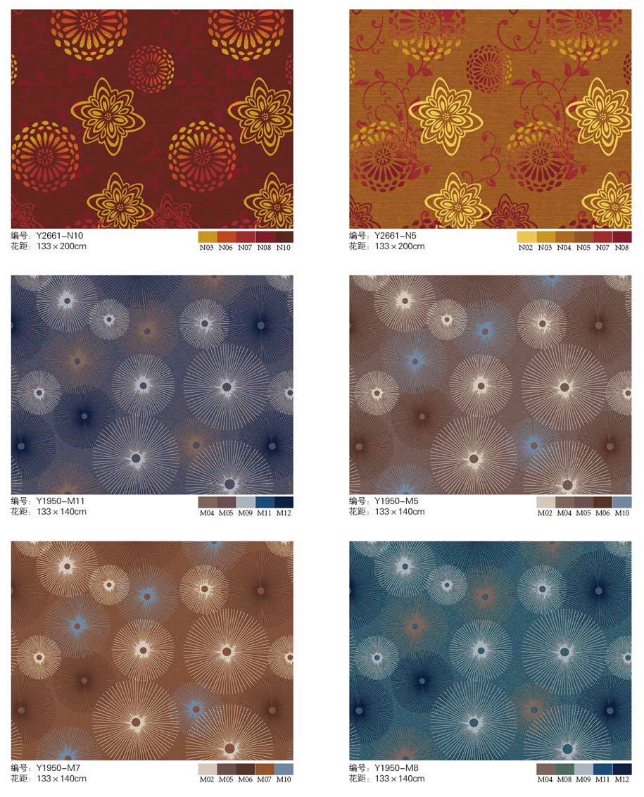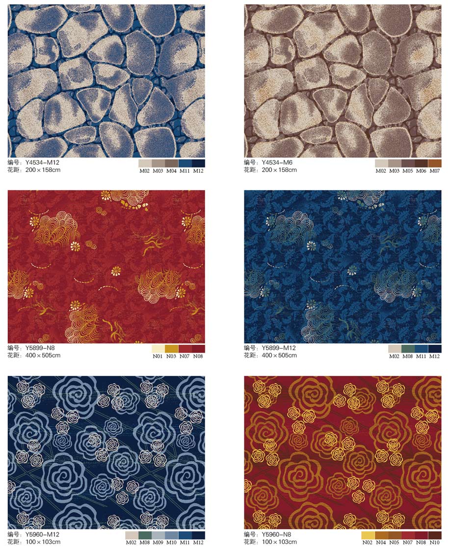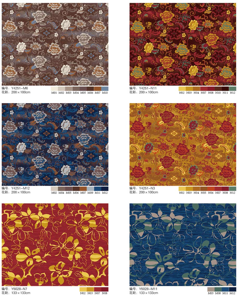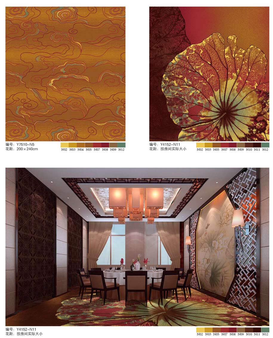 印花地毯以尼龙为原料,具备地毯弹性好、色牢度高、防霉、防虫蛀等特点。适用于各大酒店会议厅、餐厅、咖啡厅等公共区域,并可用于客房、办公室等场所。