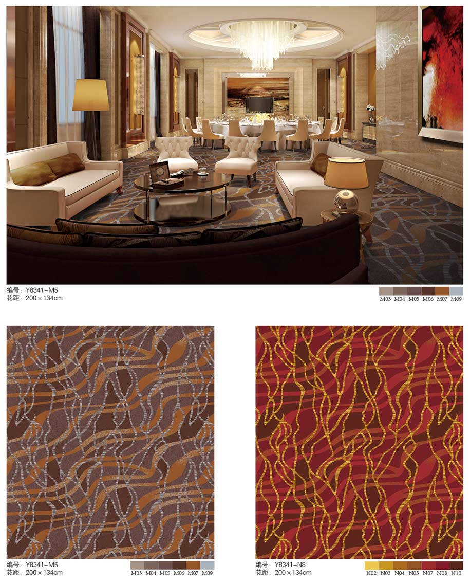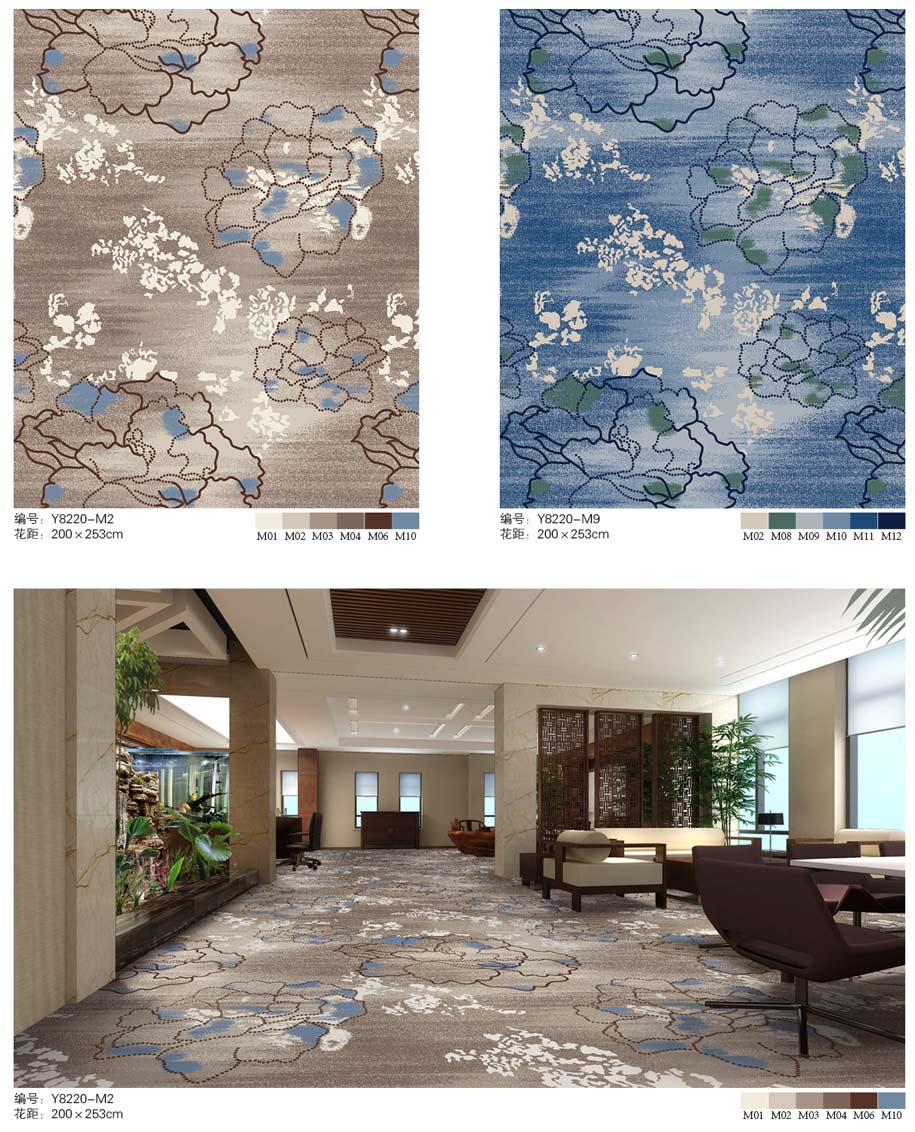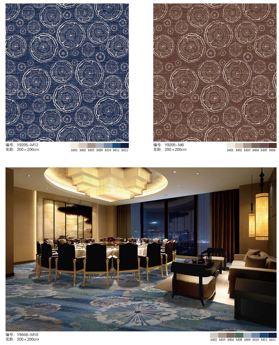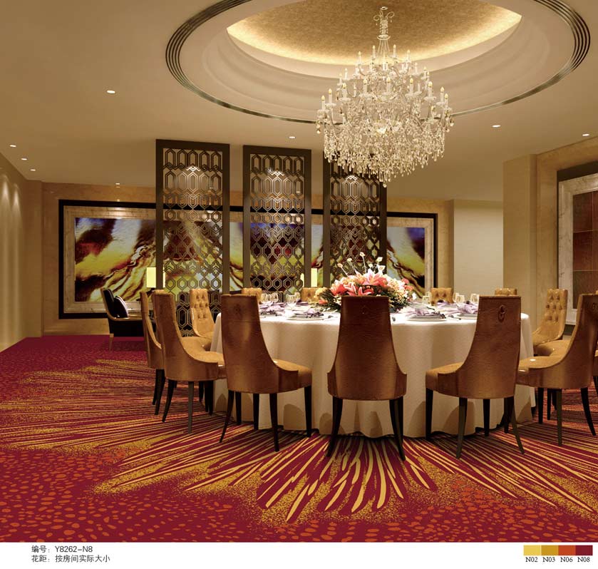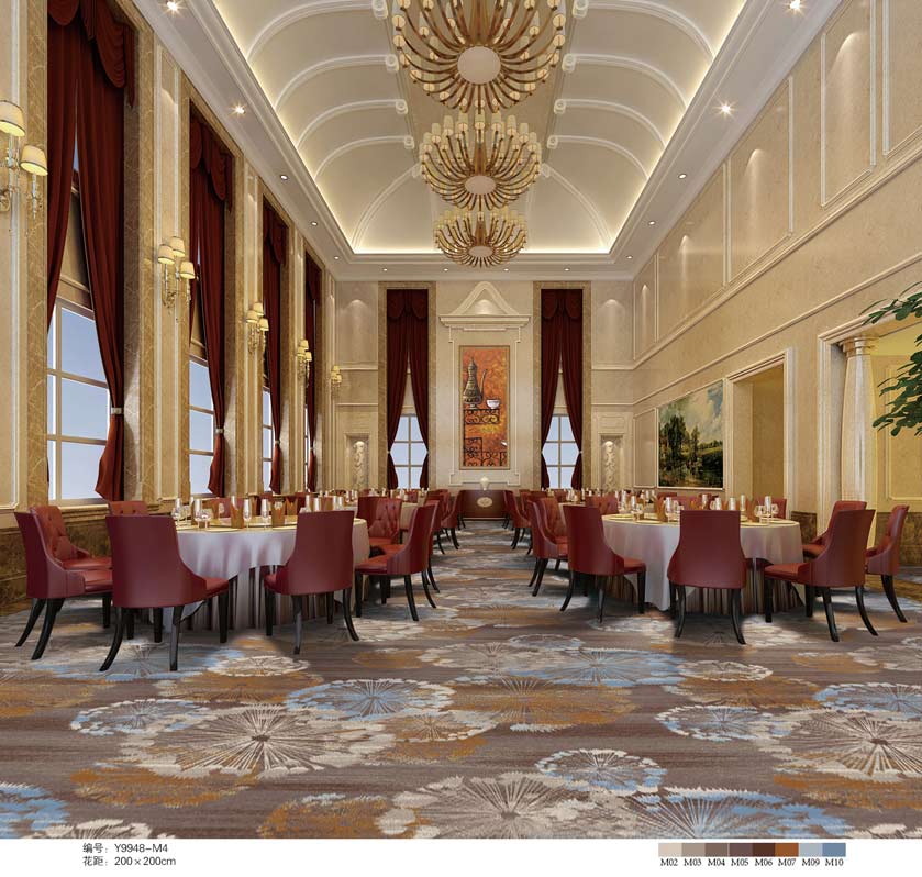 印花地毯以尼龙为原料,具备地毯弹性好、色牢度高、防霉、防虫蛀等特点。适用于各大酒店会议厅、餐厅、咖啡厅等公共区域,并可用于客房、办公室等场所。