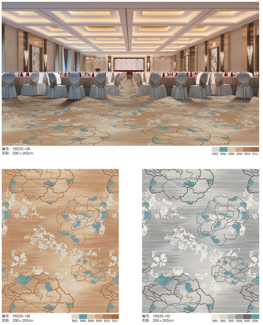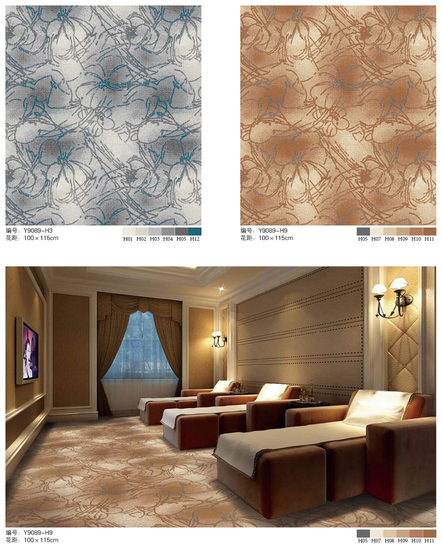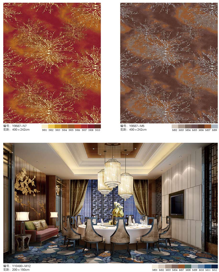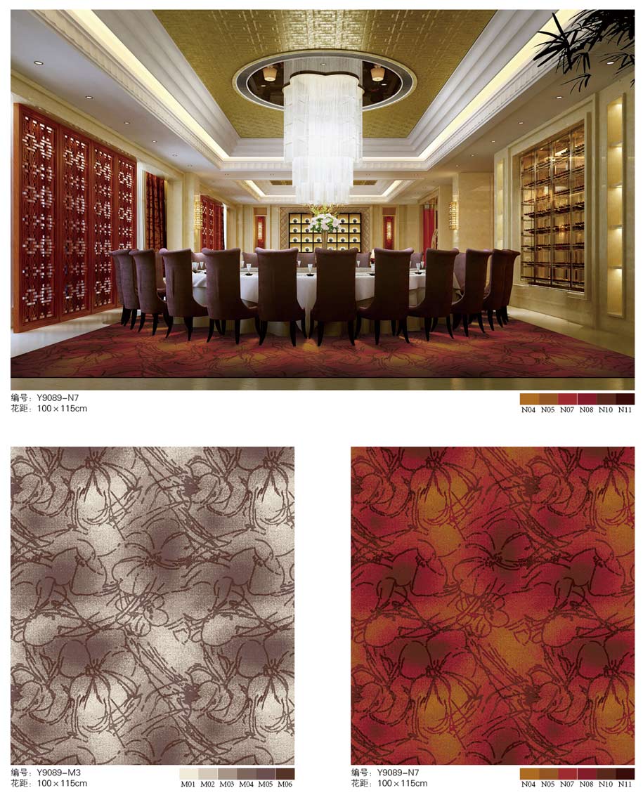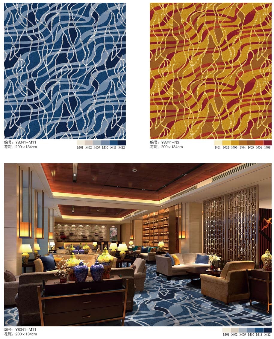 印花地毯以尼龙为原料,具备地毯弹性好、色牢度高、防霉、防虫蛀等特点。适用于各大酒店会议厅、餐厅、咖啡厅等公共区域,并可用于客房、办公室等场所。